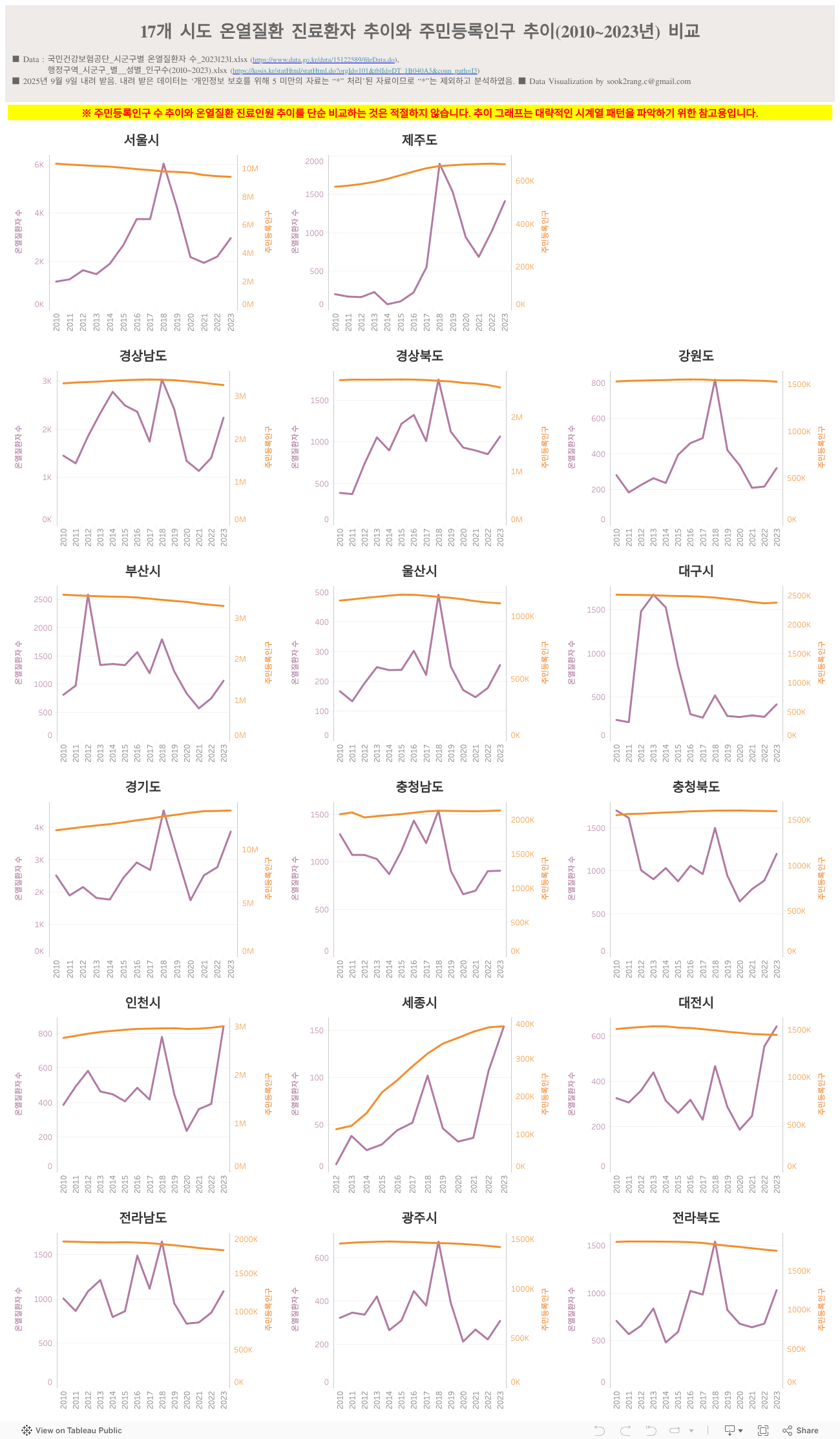 17개 시도 온열질환 진료환자 추이와 주민등록인구 추이(2010~2023년) 비교