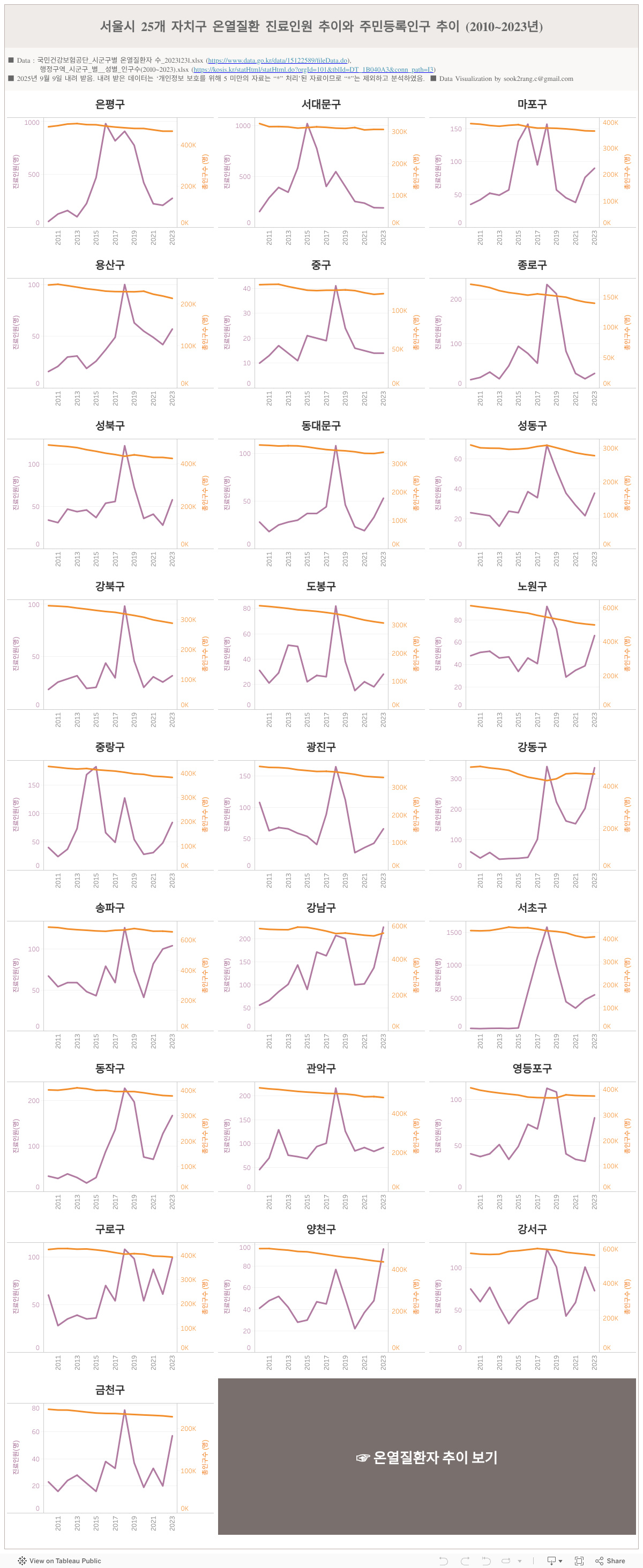 서울시 25개 자치구 온열질환 진료환자 추이와 주민등록인구 추이(2010~2023년) 비교